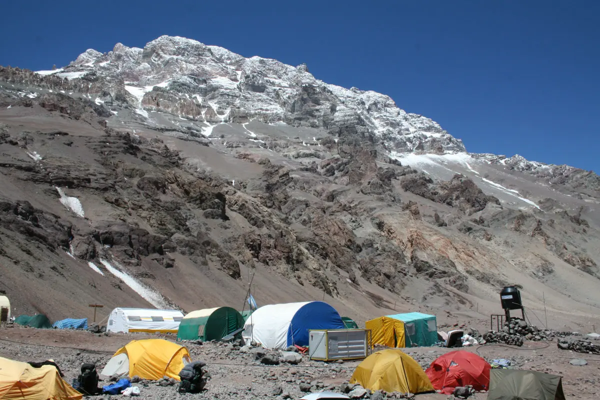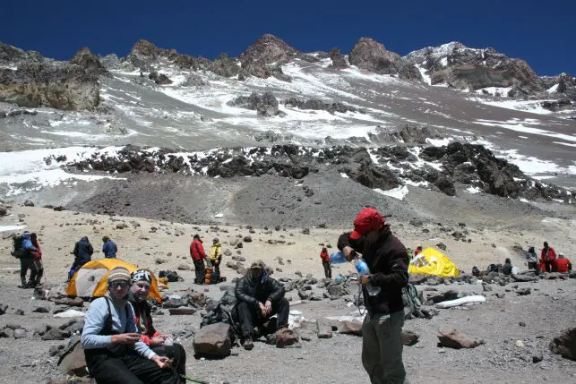 From our base camp in Plaza de Mulas we follow the trail as it gradually suitcase from steep screen slopes to the rock spires that mark Canada Camp at 5,000m (16,500ft). We pass Canada Camp and head up to Nido de Condores, our next camp 1. This usually takes 5-6 hours.