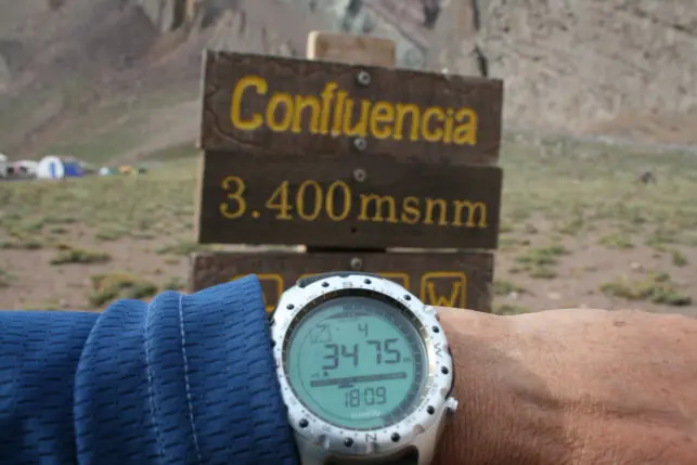 We get up for breakfast at 6:15 A.M. We catch a private car from Hosteria Puente del Inca to the Horcones Guarda Parques entrance, where we already checked in the day before. This day we begin our approach to Aconcagua. Mules will carry all of our expedition food and equipment, enabling us to enjoy this spectacular day hike with a light day pack. The trail follows the Horcones River to the junction of the Lower and the Upper Horcones River. After crossing the Lower Horcones on a footbridge, we continue up the river valley towards Confluencia, 3,400m (11,155ft), where we’ll pass this intermediate camp. From Horcones to Confluencia we’ll hike about 2 and a half hours.